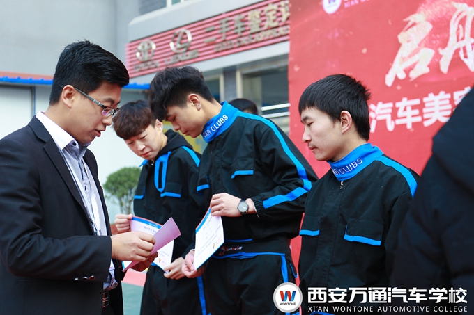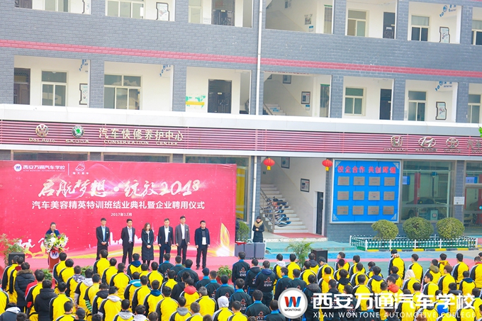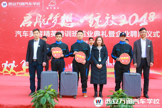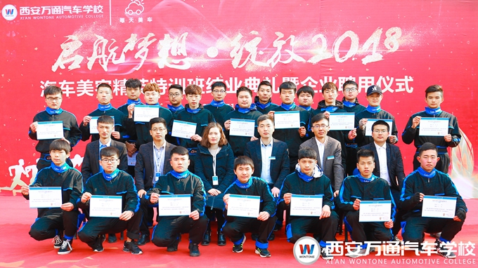 汽車美容精英特訓班是西安萬通和每天美車汽車服務連鎖企業合作成立的一個定向培養班,選拔對象是西安萬通2017屆的準畢業生,定向培養21天,企業提供工作服、優秀學子獎品,定向班的學生畢業即就業。經過21天的培訓學習,最終有22名學生脫穎而出,成為汽車美容精英特訓班的畢業生。