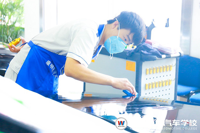 這里還有一位值得關注的人物,他就是西安萬通2016屆的畢業生肖楊樂,他個頭不高,但有著堅毅、頑強的品格,在2017年的技能PK賽中肖楊樂就參與了其中,雖然并沒取得突出的成績,但今年的技能PK賽肖楊樂再度出征,再次希望憑實力獲得榮譽。在本次PK大賽期間,獨自面對一個人要完成整輛 車的漆面養護,他表現的百折不撓,堅韌不拔,面對困哪,決不退縮,在他意識中有著“自己一定也行”信念。