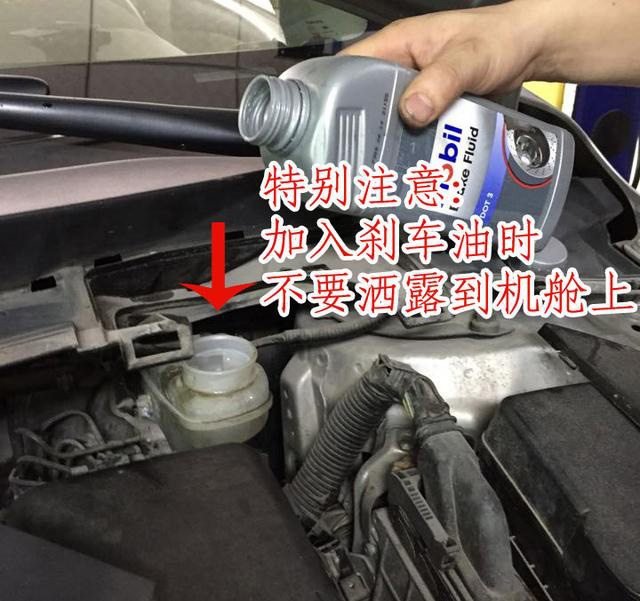 第七步 四輪全部排放完畢后,觀察引擎艙內儲油罐的油量是否已達到下限,儲油箱上有上、下限標識,如果超過下限可適當添加新的剎車油。