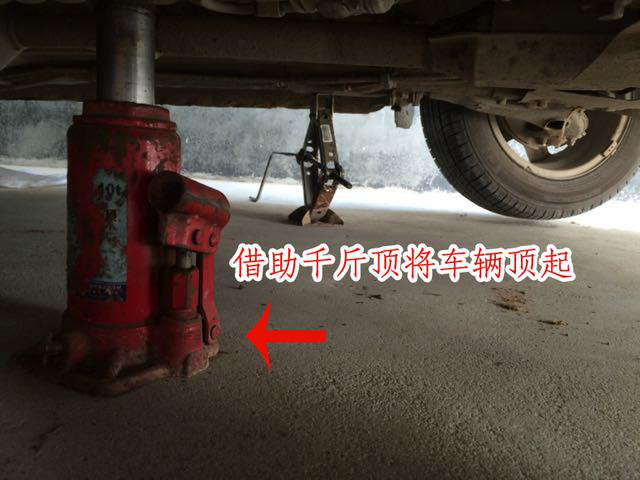 第三步 使用千斤頂將車輛頂起,先從后輪開始換油。