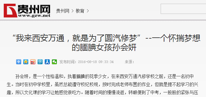 孫會妍,是一個性格溫和,執著靦腆的花季少女,在來西安萬通汽修學校之前,還是一名初中生。當時在初中學校里,雖然總能遵守校紀校規,按時完成老師布置的作業,但就是提不起學習的興趣,所以文化課的學習讓她感覺很吃力。隨著時間的慢慢流逝,轉眼便到了中考,一股股的緊張與壓力自然是不約而來,這時孫會妍就感覺到前方的路是那么的空洞與模糊。“中考要是失敗了,自己該怎么辦?”這個問題不時的會在孫會妍的腦海里浮現。