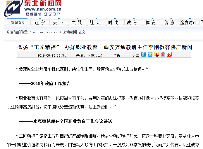 【東北新聞網】弘揚“工匠精神” 辦好職業教育---西安萬通教研主