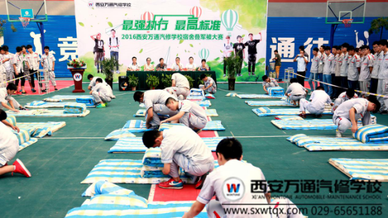 疊軍被大賽是西安萬通汽修學校踐行“三教三訓”學生管理模式的具體體現。學校定期舉辦多種形式的拓展比賽,通過這種有趣又不失嚴謹的比賽方式,寓教于樂,提高學生的綜合素質,使同學們在校學到精湛技能的同時,養成良好的行為習慣和生活習慣,也使剛剛入校的同學用“軍被精神”來鼓勵自己嚴謹認真的生活學習,更快的融入到西安萬通大家庭。