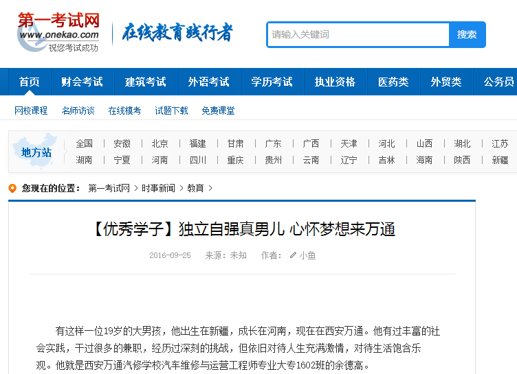 來到了西安萬通,余德高的適應能力很強,很快便融入到西安萬通的生活與學習之中,而且時間過得很快,轉眼之間已過了小半年的時間。在這段時間里,余德高在實訓技能的學習上能實事求是,不懂則問,所以對實訓技能的掌握很快也很扎實。也能積極的參與各種活動,就在近期,余德高便在2016西安萬通職業生涯規劃演講大賽上摘得第一名的榮譽。而且,余德高的空閑時間沒有用來嘻哈玩鬧,而是被他充分的利用了起來干各種兼職,比如服務員、發傳單、協警、物流分揀等。看得出來,余德高雖然年齡不大,但是已經懂得怎樣去擔負責任、面對生活。
