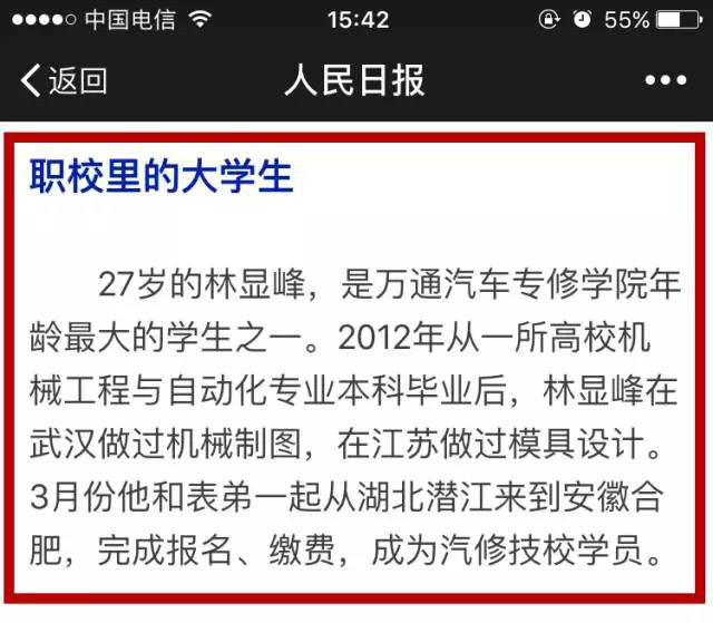 在人民日?qǐng)?bào)的微信中,提到了這樣一個(gè)人:林顯峰,萬通汽車學(xué)校年齡大的學(xué)生之一,2012年從一所高校機(jī)械工程與自動(dòng)化專業(yè)本科畢業(yè)后,曾在武漢做過機(jī)械制圖,在江蘇做過模具設(shè)計(jì)。