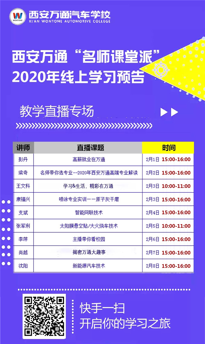 為減少人員聚集,阻斷疫情傳播,西安萬通汽車學校在開通線上報名通道后,自1月30日起,特應廣大學生和家長的要求,開啟線上直播課堂。學生、家長都可通過直播平臺,在線與金牌職業規劃師和行業頂尖專家溝通交流,足不出戶就能輕松了解學校、咨詢專業前景、創就業等各個方面的問題。