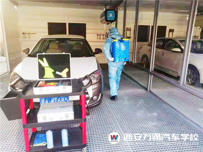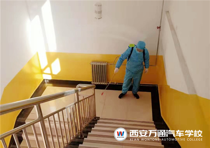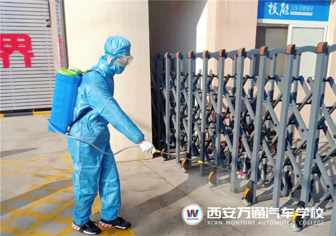 除了日常清潔實行分區管理之外,西安萬通汽車學校每天還安排輪班,有專門的消毒人員利用噴霧式消毒機,對教學樓、實訓中心、衛生間、餐廳等校園公共場所進行消殺作業,學校還準備了充足的體溫槍、消毒液等防控物資,以待開學全力守護師生健康安全。