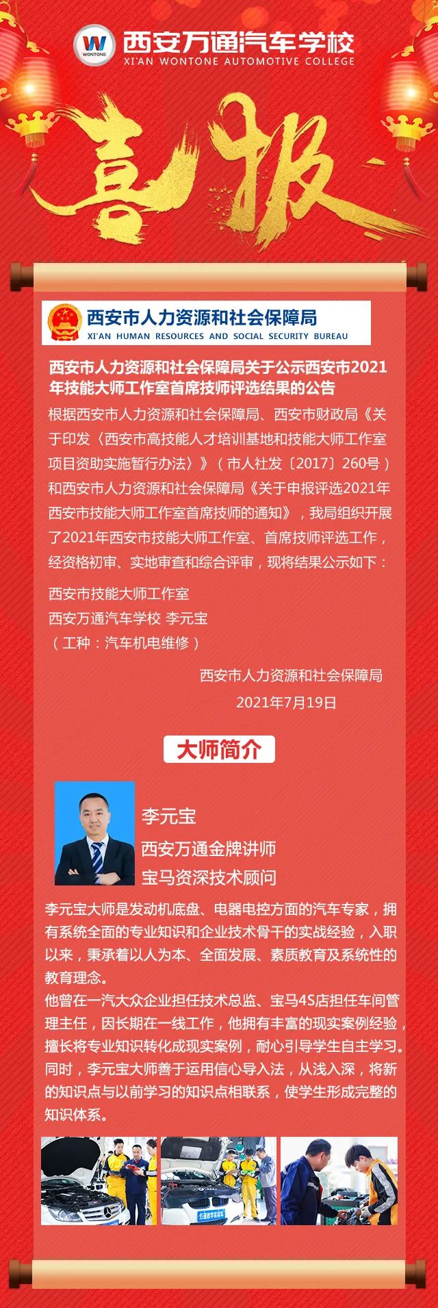 近日,西安市人力資源社會保障廳公布2021年市級技能大師工作室名單,我校金牌講師李元寶汽車機電維修工作室被評為西安市技能大師工作室!