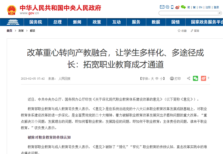 2022年12月21日,中辦、國(guó)辦印發(fā)《關(guān)于深化現(xiàn)代職業(yè)教育體系建設(shè)改革的意見(jiàn)》,《意見(jiàn)》持續(xù)優(yōu)化職業(yè)教育的類型定位,教育部職業(yè)教育與成人教育司司長(zhǎng)陳子季在發(fā)布會(huì)上稱,職業(yè)教育不是“終結(jié)教育”,也不是“低層次教育”,更不是“淘汰教育”,而是特色鮮明的一種教育類型,我國(guó)職業(yè)教育進(jìn)入了新的階段。