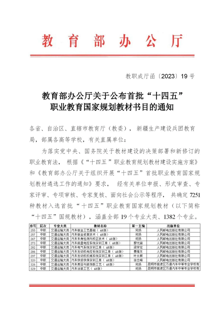 近日,根據(jù)教育部發(fā)布的《教育部辦公廳關(guān)于公布首批“十四五”職業(yè)教育國(guó)家規(guī)劃教材書目的通知》文件獲悉,由萬通汽車教育編寫的10本教材入選!這一重要榮譽(yù)標(biāo)志著萬通汽車教育在汽車職業(yè)教育領(lǐng)域的貢獻(xiàn)得到了國(guó)家的認(rèn)可與支持,將進(jìn)一步推動(dòng)汽車教育行業(yè)的規(guī)范化和專業(yè)化發(fā)展。